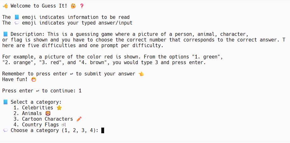 There will be two options: one for guessing with images and another for guessing with words. The images will have categories of celebrities, cartoon characters, animals, and country flags. The words will have categories of random words, with three difficulties: easy words to guess, medium, and hard words with less hints.