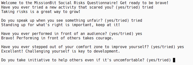 This is a questionnaire about taking social risks, awarding you points for being brave and taking risks, encouraging you to be confident in yourself socially.